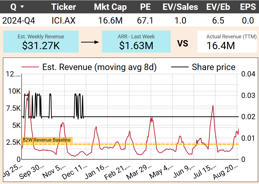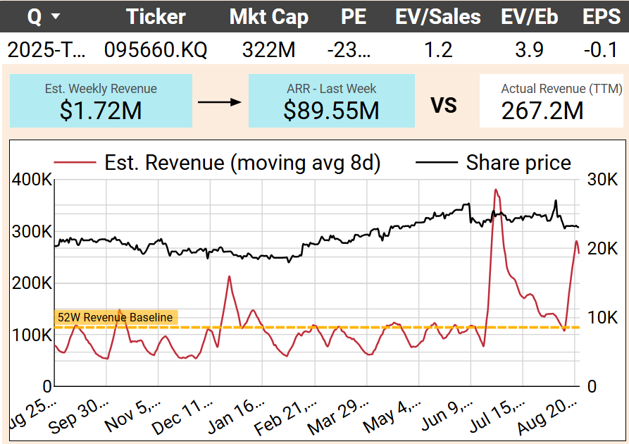 iCandy’s ~90% boost in estimated revenue was mainly from Power Rangers: Legacy Wars, a title that’s been around for years. The increase barely shifts the company’s financial picture, adding less than $1M annualized against its $16M market cap. The chart suggests normal variability rather than a structural uptrend. Combined with stretched multiples (PE above 60×), the move doesn’t look like a catalyst — more a temporary blip.
