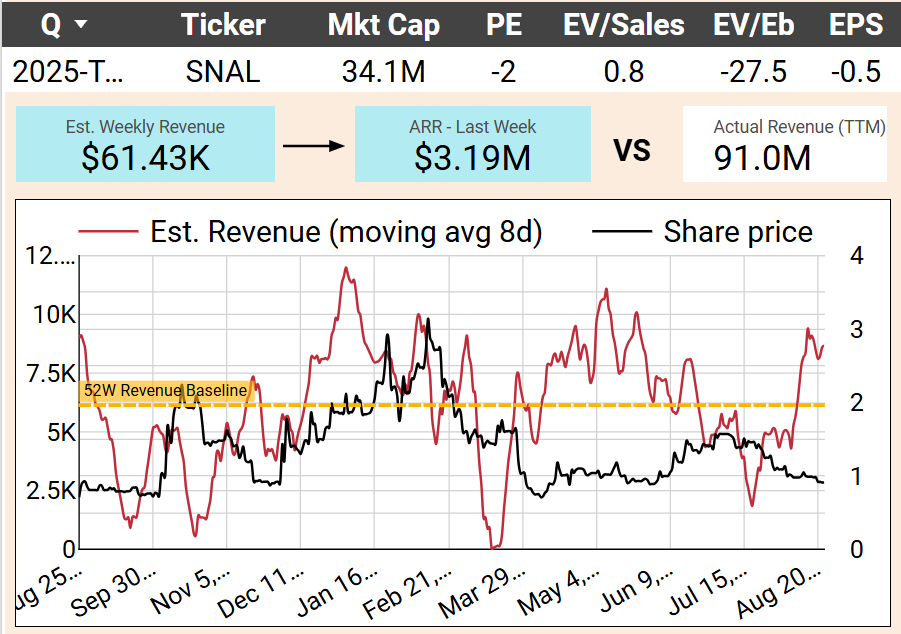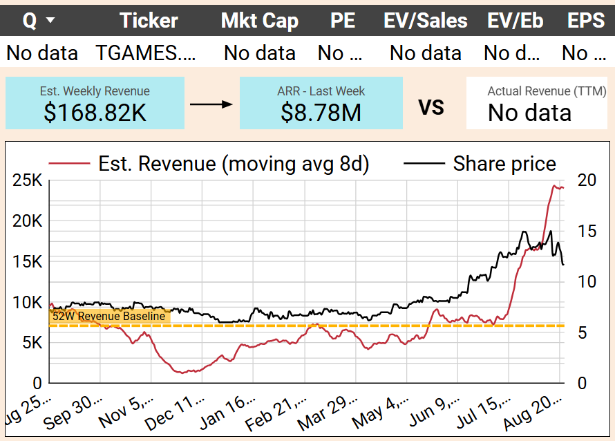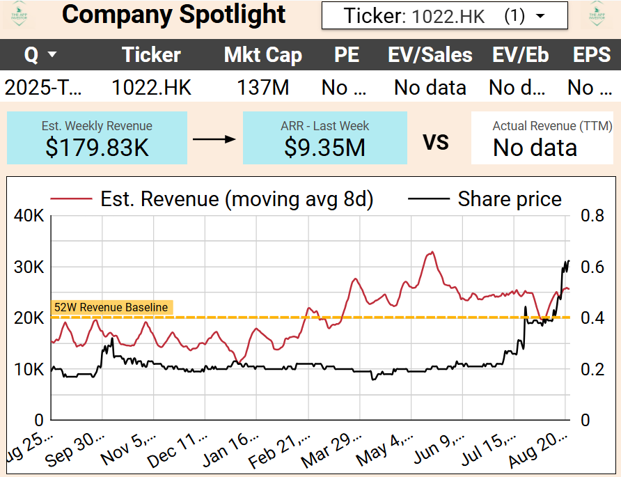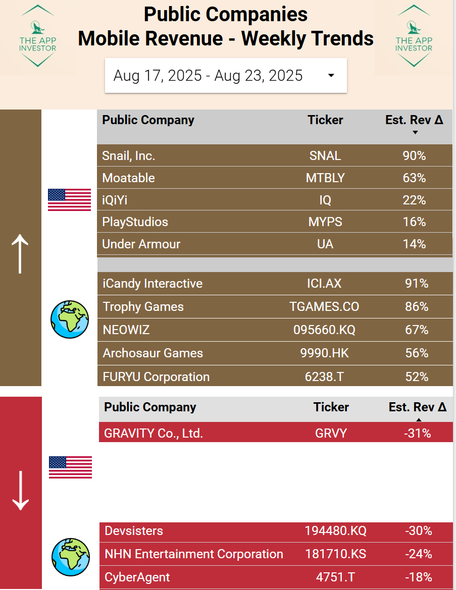 Snail posted a sharp revenue jump this week, largely off the back of Nine Yin and Taichi Panda. While the uptick looks impressive in percentage terms, the absolute dollars remain trivial compared to its ~$70M TTM revenue base and $30M market cap. Historically, Snail’s mobile revenue has been highly erratic, and this week’s spike looks more like noise than a trend. With negative profitability and no clear new catalyst, it’s hard to see this as meaningful for investors.