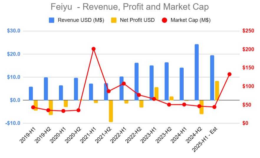 We first highlighted Feiyu in our initial article in May 2022 when “Fighting Ghosts” (or “Fight Tricks”) spiked revenue; and after a massive stock hike which we definitely should’ve sold (cf chart below), for much of 2023–24 the market yawned.