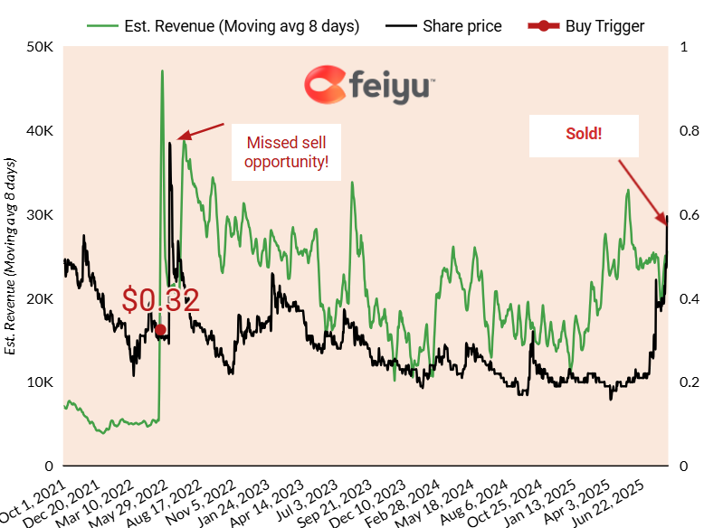 Could Feiyu run further? Sure. But after a clean catalyst, profitable H1, and a 3x move in two months, we’d rather book the gain and scan for the next setup. One where the stock has more liquidity and interest, so we don’t have to wait 3 years to book our gains.