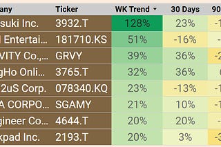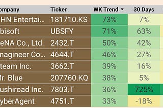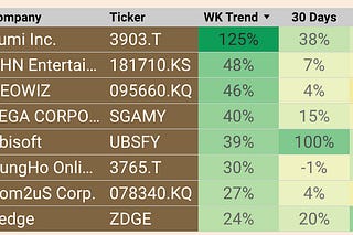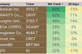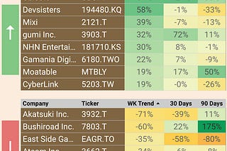 Not catalyst in the horizon this week, whilst Gravity and Gumi show up the laggards bucket.